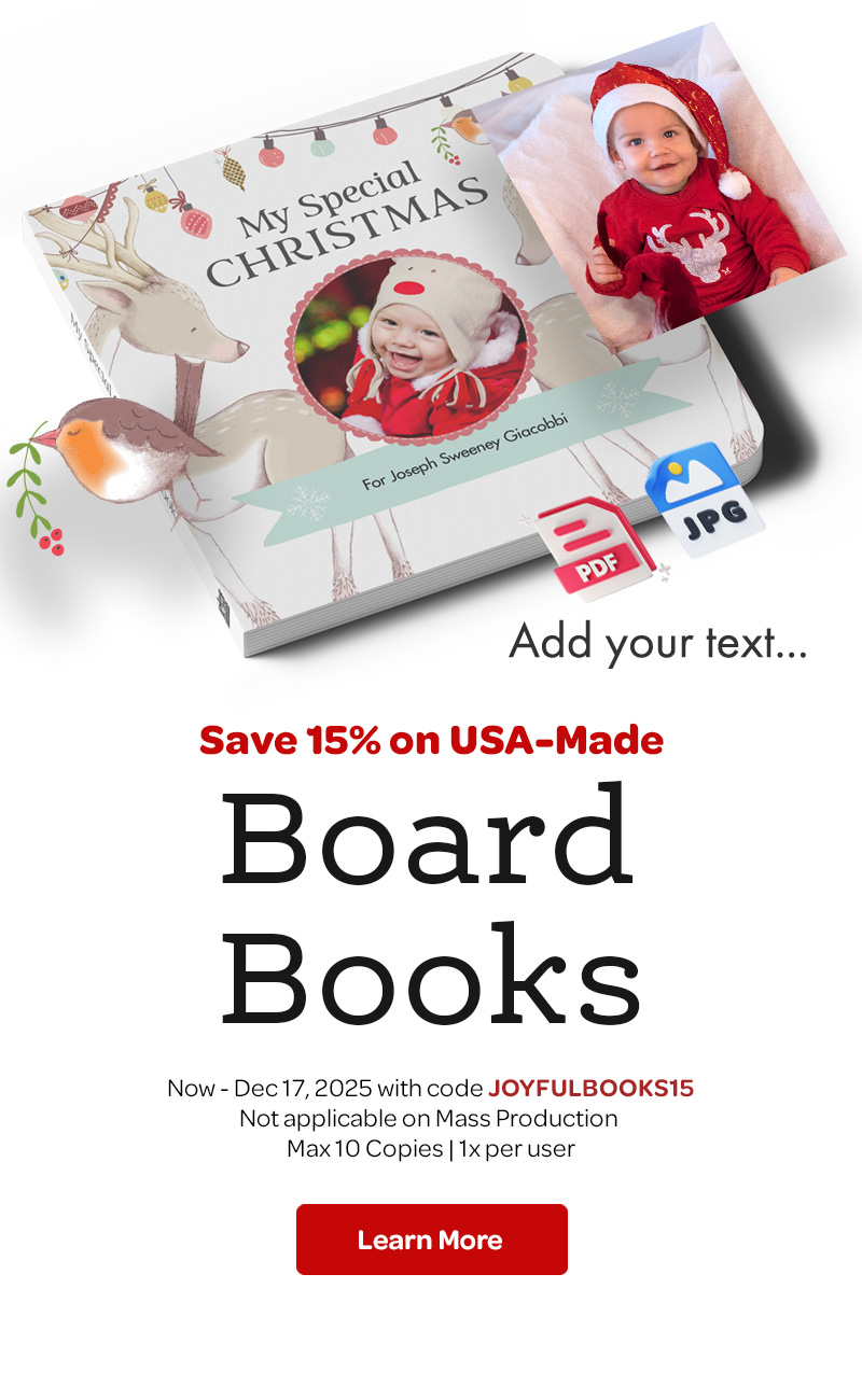 Make your own custom board book for babies and children with our online board book editor. Every board book you create is printed and bound at our USA board book printing and manufacturing plant. These customizable board books are the perfect solution for individuals, teachers, artists, illustrators, and designers who want to make and order board books in individual or small quantities.